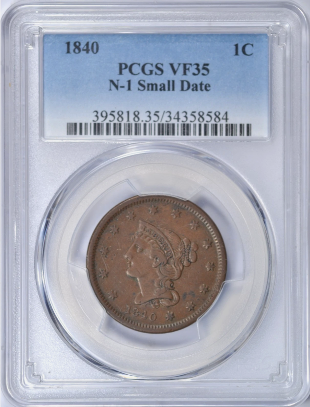 1840 BRAIDED HAIR LARGE CENT SMALL DATE N-1 PCGS VF35